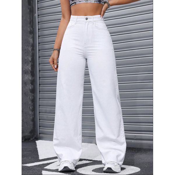 This pair of white jeans is made of 100% pure cotton fabric. It has a soft and comfortable texture, good breathability and moisture absorption, and is suitable for all seasons. The color is pure white, giving a fresh and simple feeling. It features a high-waist cut, which can effectively enhance the waistline and elongate the leg proportion, making the figure appear more slender. The straight-leg design flatters the leg lines, and it can be easily worn for X-shaped legs or O-shaped legs, making the legs look straight and long. It can be paired with casual shoes, sports shoes or high heels, presenting different style charm.